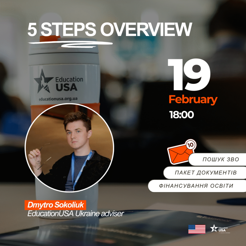 Радник консультативного центру мережі EducationUSA Ukraine, Соколюк Дмитро, розповість про 5 кроків до навчання в США, стипендіальні програми, програми обміну, особливості вступного процесу та способи фінансування. Ви матимете нагоду поставити запитання та отримати професійні поради.