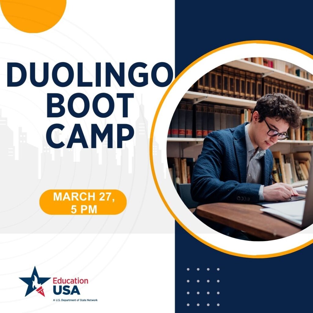 Duolingo Boot Camp – це інтенсивна онлайн-програма для майбутніх студентів бакалаврату та магістратури, яка буде дуже корисною для старшокласників, зацікавлених у навчанні в США. Учасники познайомляться з іспитом DET, побачать його структуру та дізнаються про те, як і коли краще починати до нього готуватися, щоб отримати найвищі бали.