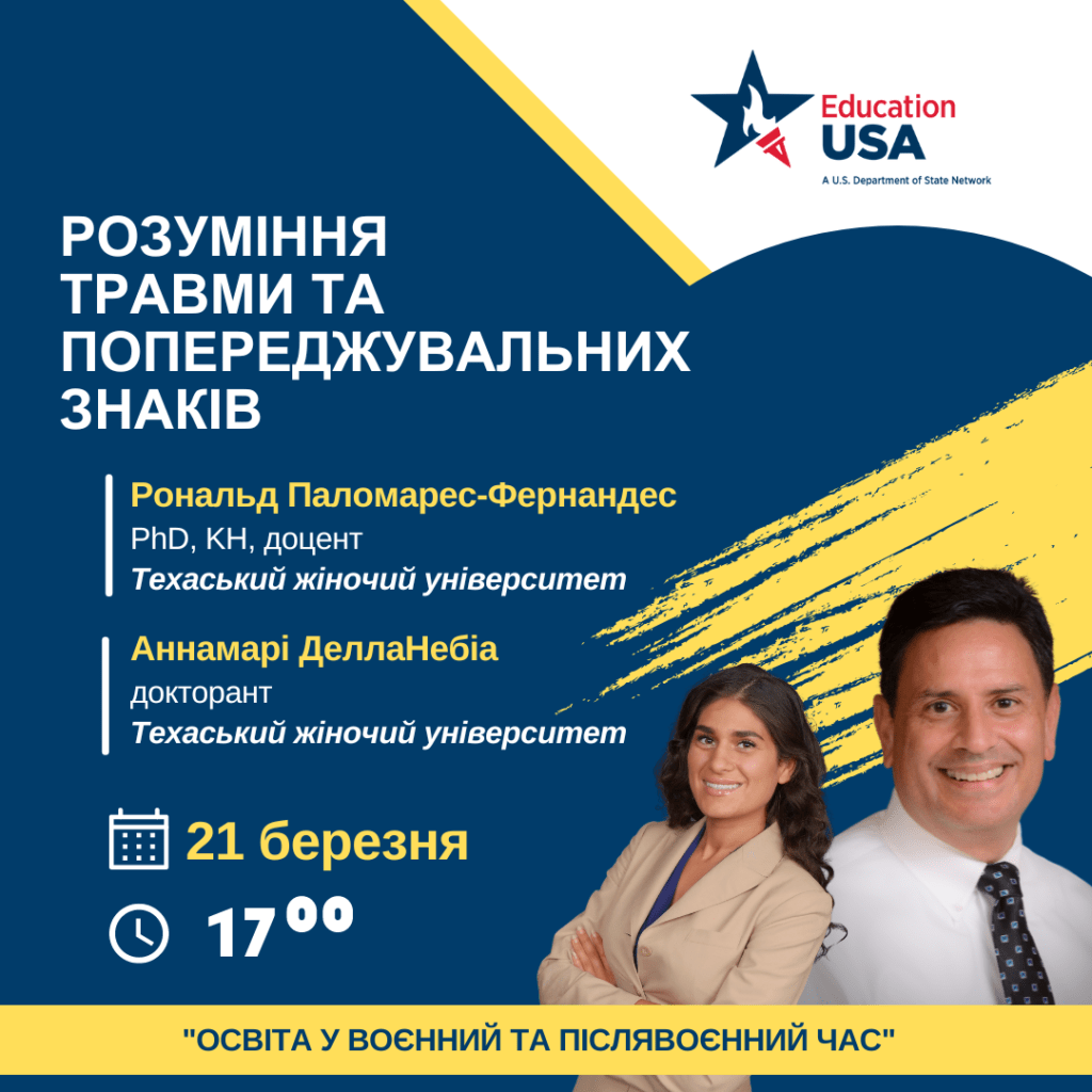 Приєднуйтесь до вебінару з Рональдом С. Паломаресом-Фернандесом, доктором філософії, доцентом Школи соціальної роботи, психології та філософії і докторанткою Школи психології Аннамарі ДеллаНебіа Техаського жіночого університету та дізнавайтеся про особливості психологічних травм та ознаки, що допоможуть їх розпізнати та попередити.