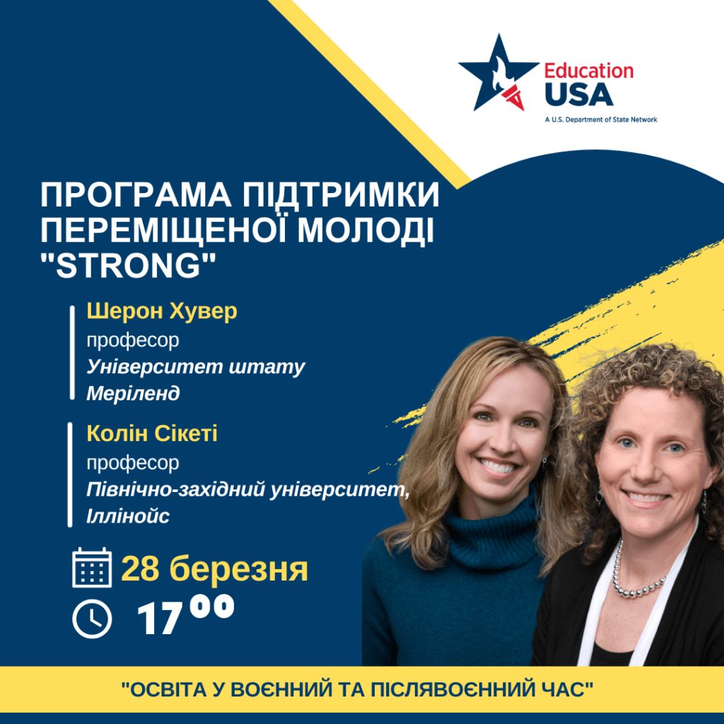 Приєднуйтеся до вебінару Шерон Хувер, професора Університету штату Меріленд і Колін Сікеті, професора Північно-західного університету, Іллінойс та дізнайтеся про роль школи і викладачів у створенні сприятливого середовища та підтримки переміщеної молоді, а також особливості програми STRONG.
