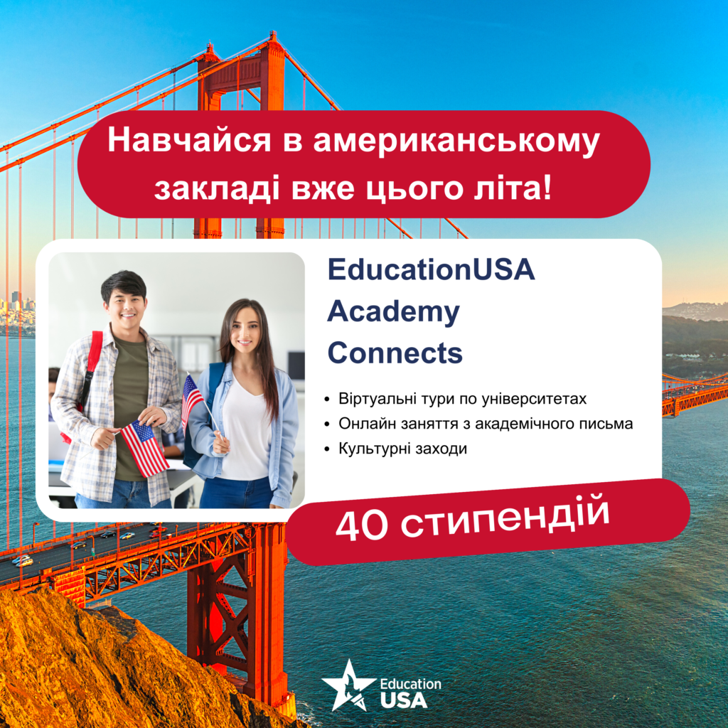 EducationUSA Ukraine оголошує набір учасників на програму EducationUSA Academy Connects, в рамках якої Ти зможеш віртуально навчатись протягом 3-4 тижнів в одному з восьми університетів США під час літніх канікул. EducationUSA Ukraine покриє витрати на навчання для відібраних учасників. Всього доступно 40 стипендій! Все, що потрібно мати – стабільний Інтернет та бажання навчитись новому!