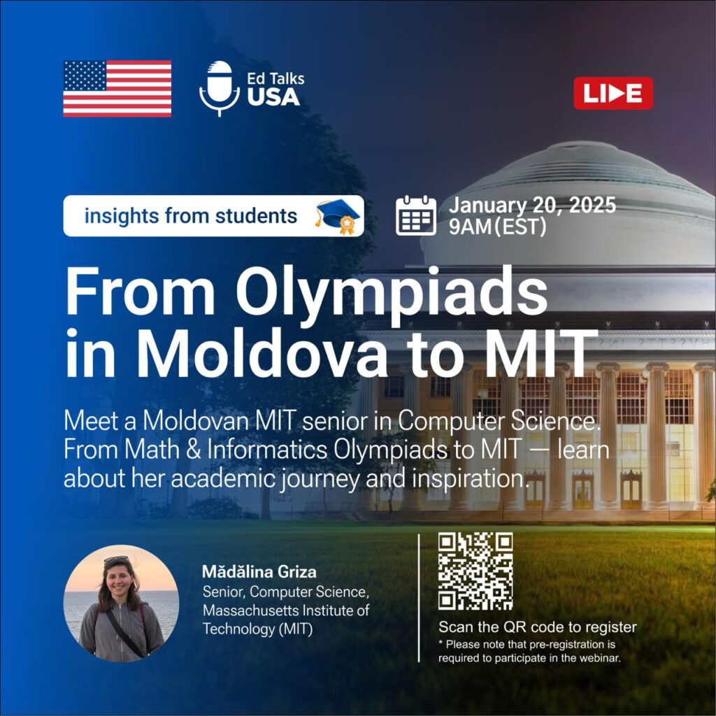 Приєднуйтесь до надихаючого вебінару з Mădălina Griza, студенткою з Молдови, яка зараз навчається на останньому курсі MIT за спеціальністю Компʼютерні науки зі спеціалізацією в Медіадослідженнях. Її шлях розпочався з участі в олімпіадах з математики та інформатики в Молдові — саме цей досвід запалив її пристрасть до розв’язання складних задач, інновацій і технологій та зрештою став основою для успішного вступу до MIT.
