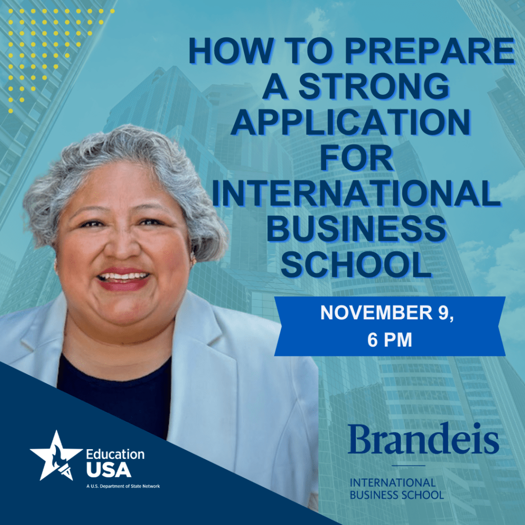 Будь ласка, приєднайтеся до вебінару з Терезою Родрігес, заступницею директора з питань прийому Міжнародної школи бізнесу Університету Брендейс, яка розповість усе, що потрібно знати про навчання на програмі з бізнесу в США, та поділиться порадами щодо того, як створити сильну аплікаційну заявку та ефективний мотиваційний лист.