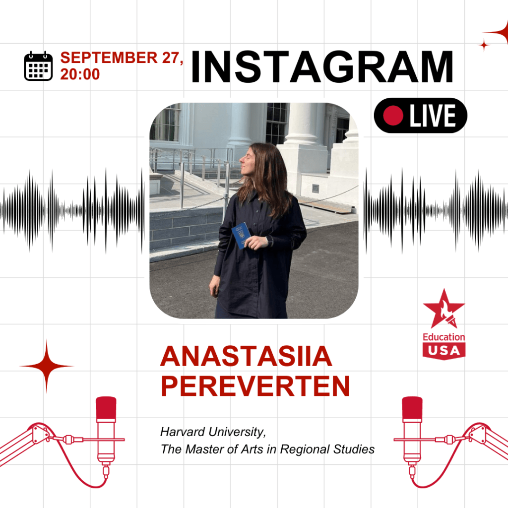 Приєднуйся до прямого ефіру в Instagram з Анастасією Перевертень, українською студенткою, яка зараз навчається в Гарвардському університеті на магістерській програмі.