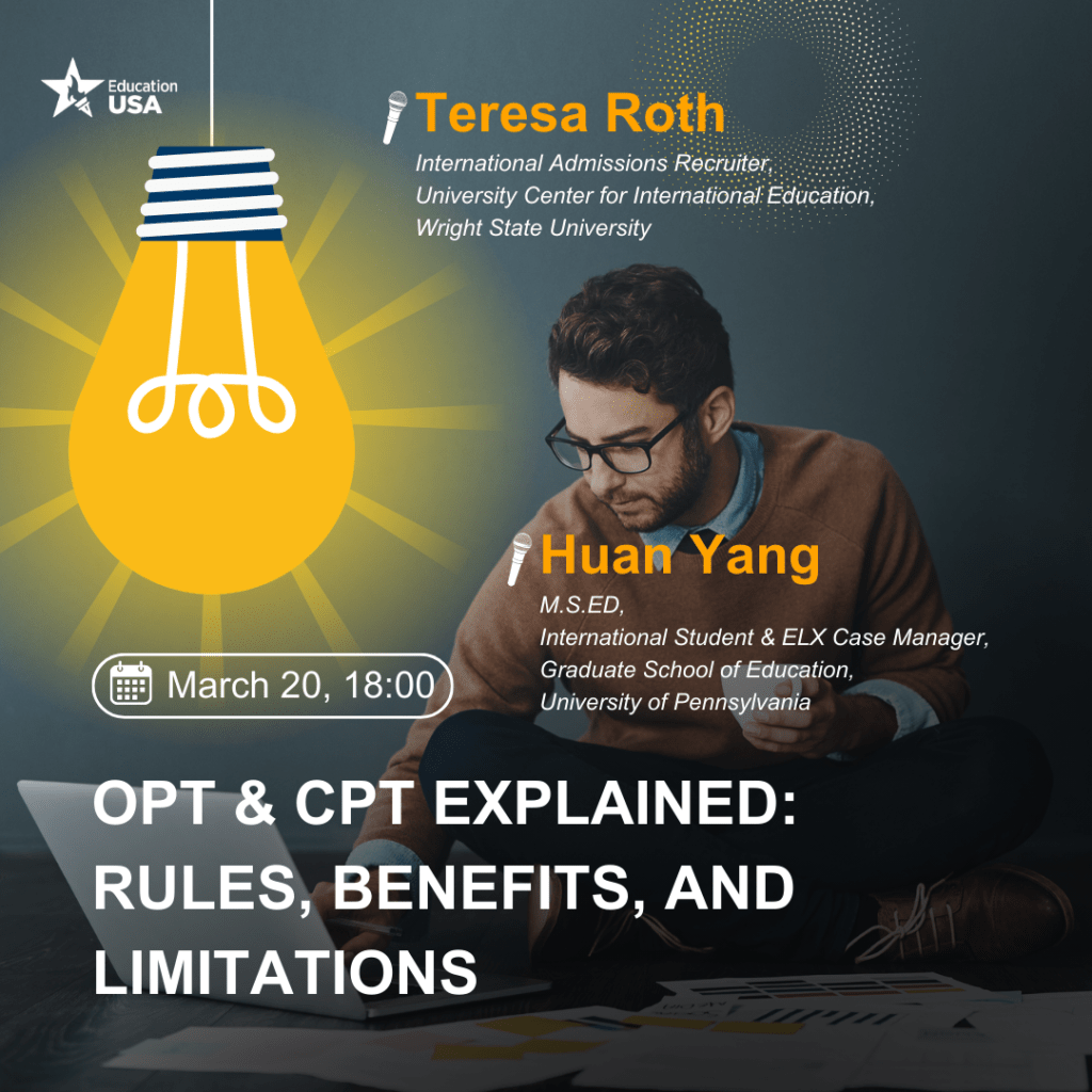 Дізнайтесь все про можливості проходження OPT та CPT від Teresa Roth, директорки з міжнародного рекрутингу в Wright State University, та Huan Yang, магістра наук у галузі освіти, менеджерки по роботі з міжнародними студентами та з питань освітньої лінгвістики (ELX, Educational Linguistics) в University of Pennsylvania.