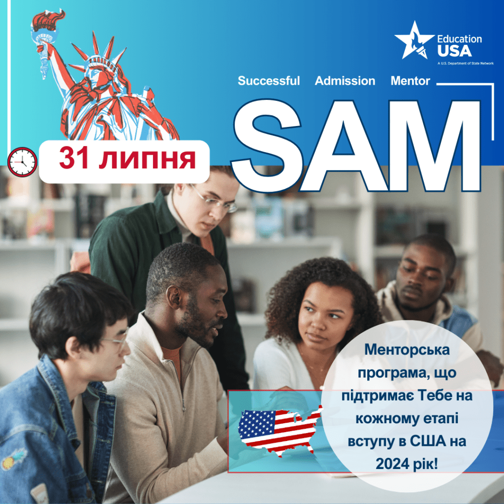 SAM (Successful Admission Mentor) – менторська програма від EducationUSA, що пропонує практичну підтримку на кожному кроці вступу для тих, хто хоче розпочати навчання в США у 2024 році.