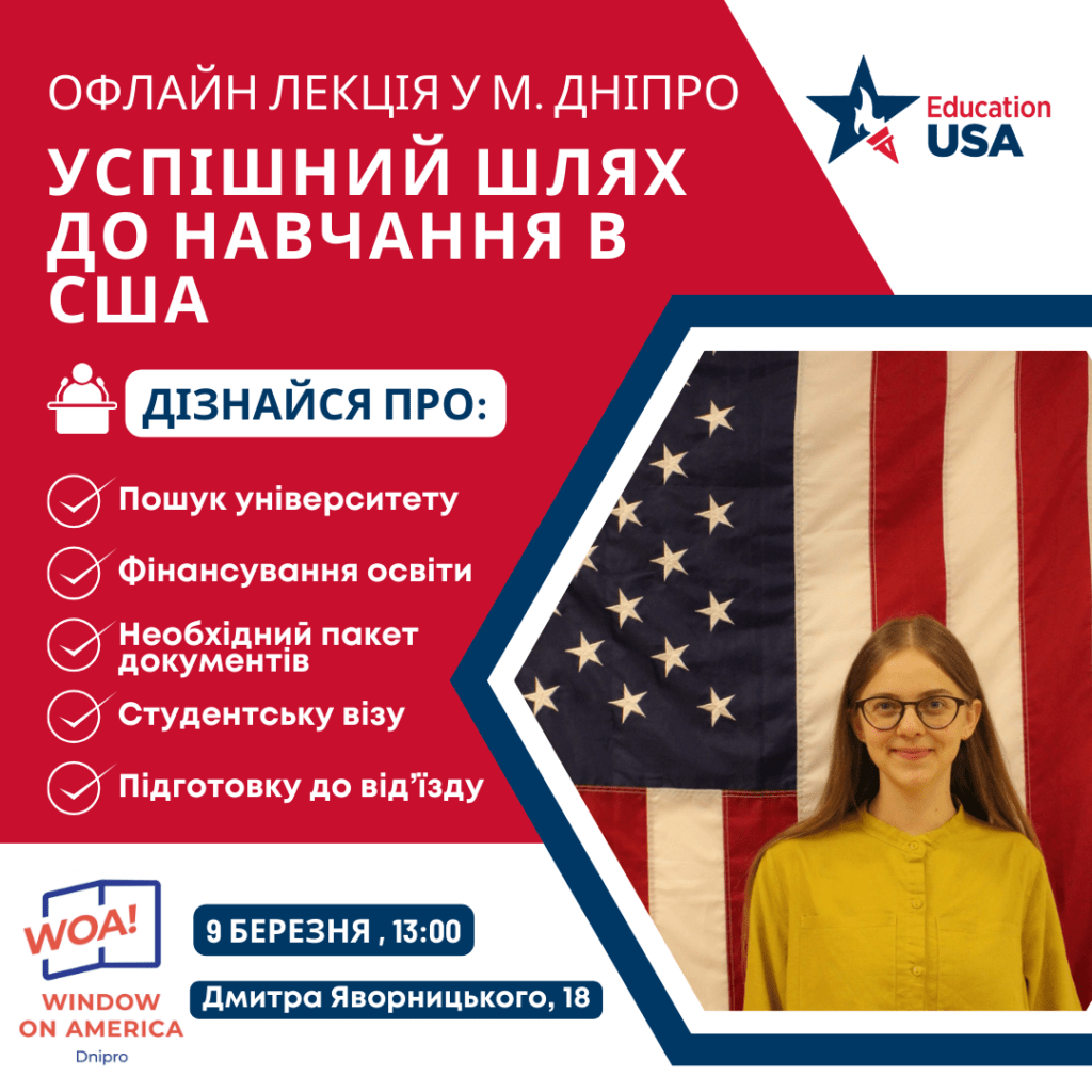 Радниця консультативного центру мережі EducationUSA в Україні розповість про 5 кроків до навчання в США, стипендіальні програми, програми обміну, особливості вступного процесу та способи фінансування. Ви матимете нагоду поставити запитання та отримати професійні поради.