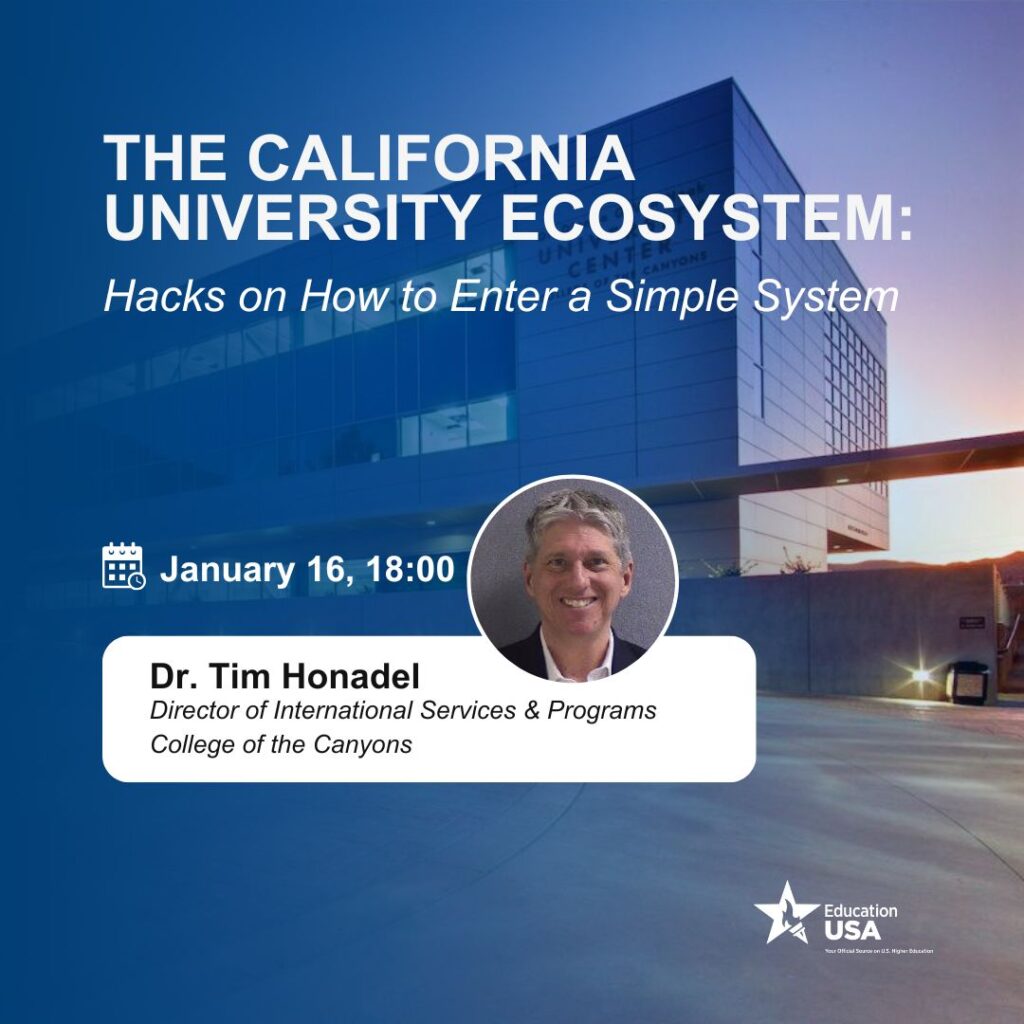 Приєднуйся до вебінару з Tim Honadel, директором відділу міжнародних програм та послуг в College of the Canyons. Зрозумієш як працює екосистема університетів Каліфорнії і специфіку вступу, дізнаєшся, як максимально ефективно підготувати та подати свою заявку, які ресурси доступні для міжнародних студентів, і найголовніше, отримаєш дієві практичні поради для тих, хто хоче вступити до університетів Каліфорнії.
