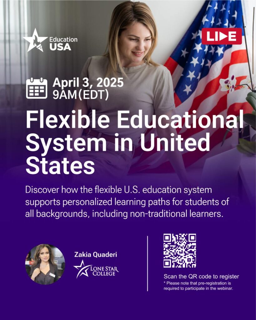 Приєднуйтесь до лекції з Zakia Quaderi з Lone Star College 3 квітня о 16:00, щоб дізнатися, як американська система освіти підтримує усіх студентів і які освітні варіанти пропонує — від професійної освіти до навчання в університеті.