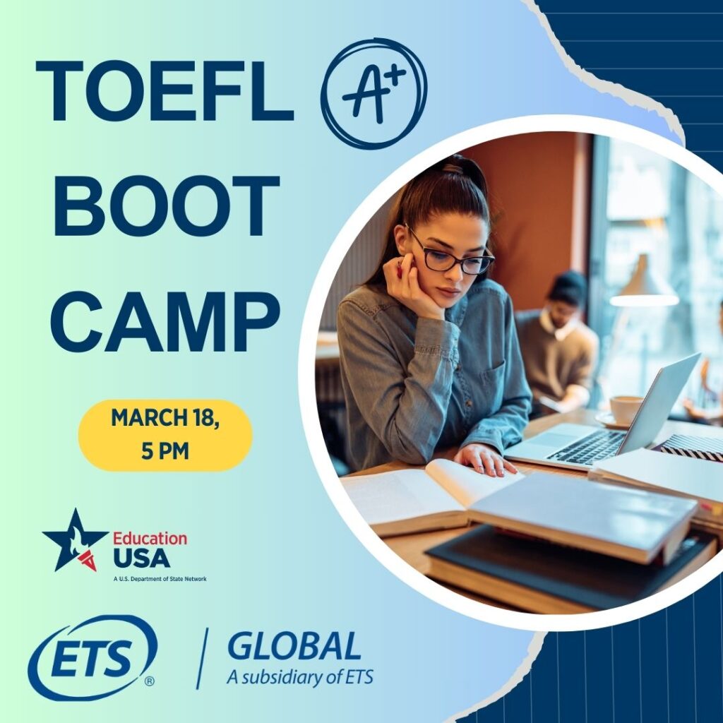 TOEFL Boot Camp — це інтенсивна онлайн-програма для майбутніх абітурієнтів до університетів США, які хотіли б дізнатися більше про стандартизовані тести, зокрема про TOEFL iBT тест і підготовку до нього. Ця програма орієнтована на майбутніх студентів будь-якого рівня навчання – бакалаврату, магістратури чи докторантури.