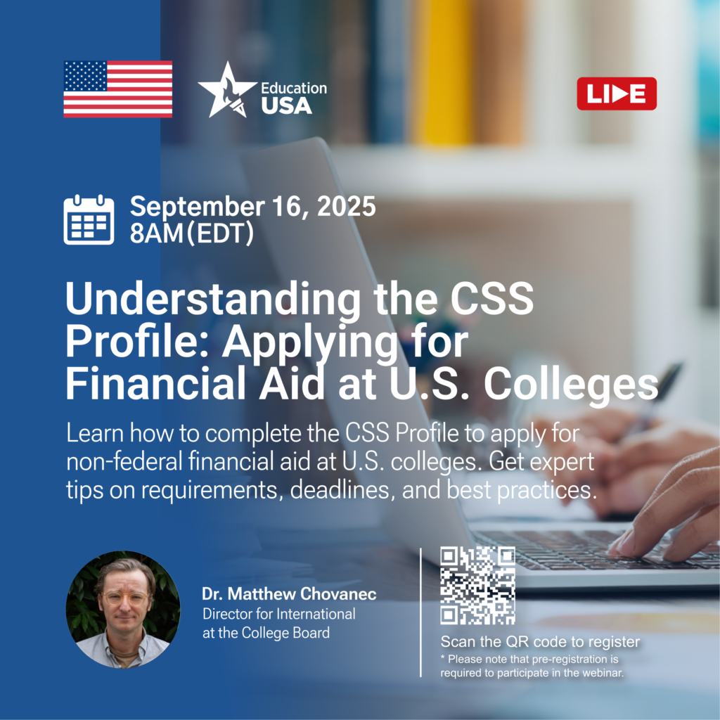 Плануєте подавати заявку на фінансову допомогу в коледжах та університетах США? Приєднуйтесь до нас на спеціальний вебінар, присвячений профілю CSS, ключовій заявці на фінансову допомогу, яку використовують сотні установ США для надання нефедеральної допомоги. Ми раді вітати доктора Метью Хованека, директора з міжнародних питань College Board, який охоплює Південно-Західну Азію та Північну Африку. На цій сесії доктор Хованек проведе студентів та їхні сім’ї через процес створення профілю CSS та відповість на поширені запитання, зокрема: